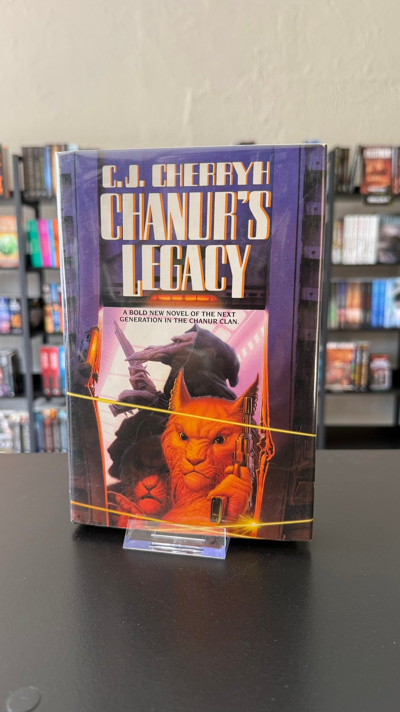 Hiffy Chanur, once a member of her aunt’s crew on The Pride of Chanur, is now captain of her own vessel, Chanur’s Legacy. It should have been the ideal existence for Hiffy, her fondest dream fulfilled, but instead the young captain’s increasingly hard-pressed to take care of her ship’s business. So when Meetpoint’s stationmaster offers her a million credits to transport a small, mysterious, “religious” object it seems like a golden opportunity–perhaps even too good an opportunity…. Yet despite her misgivings, Hiffy feels it’s a commission she can’t turn down. But soon she and the Legacy are caught in an ever-tightening web of intrigue. And only time will tell whether the young captain can determine who is her ally and who is her enemy in this deadly game of interstellar politics…