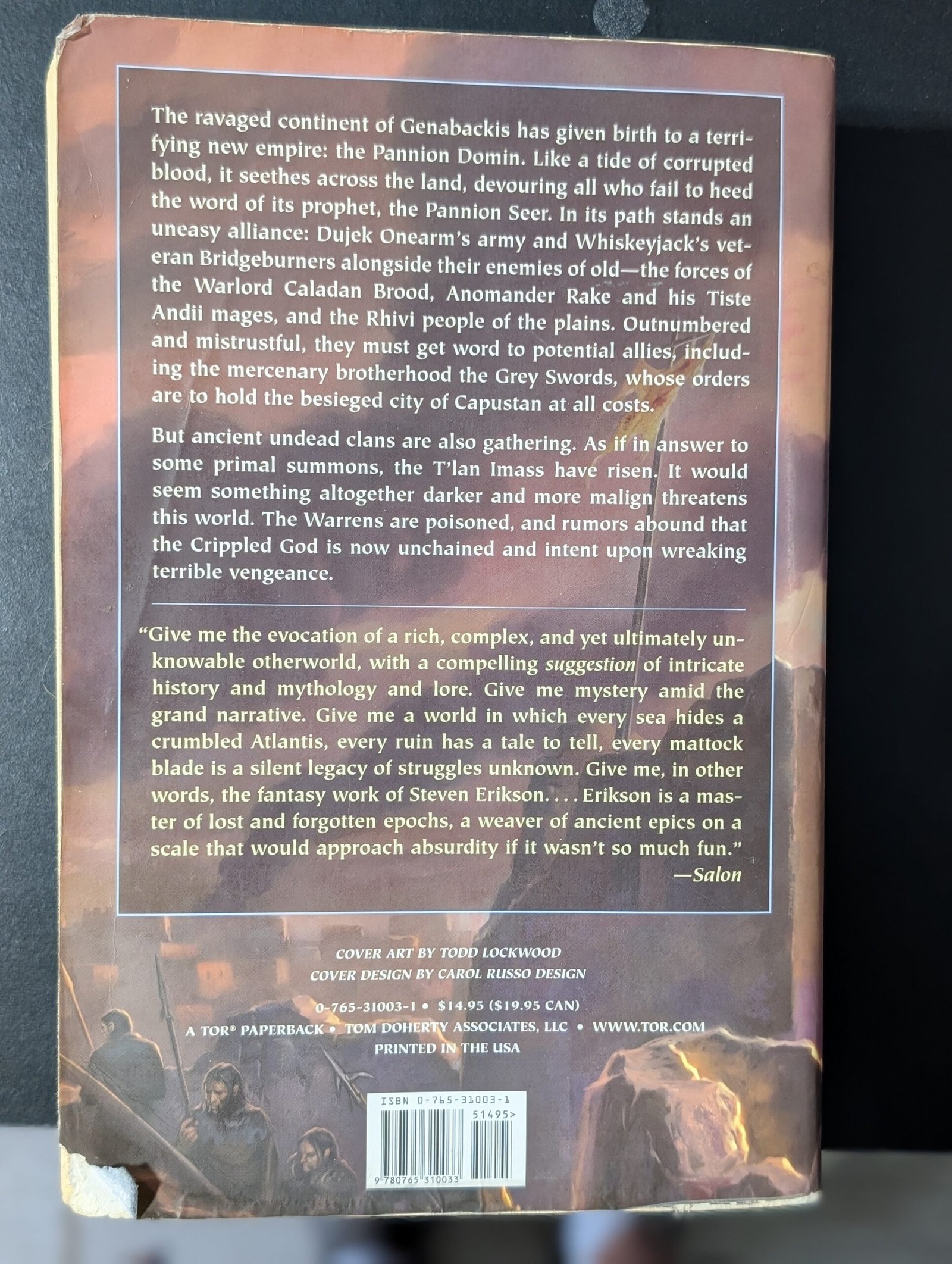 The ravaged continent of Genabackis has given birth to a terrifying new empire: the Pannion Domin. Like a tide of corrupted blood, it seethes across the land, devouring all. In its path stands an uneasy alliance: Onearm’s army and Whiskeyjack’s Bridgeburners alongside their enemies of old–the forces of the Warlord Caladan Brood, Anomander Rake and his Tiste Andii mages, and the Rhivi people of the plains.